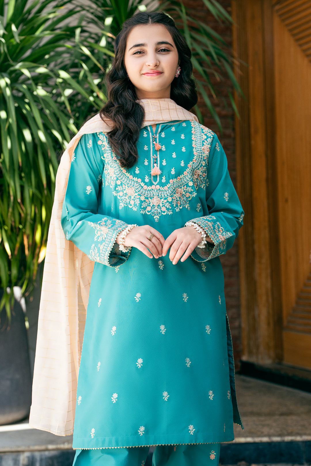 Elegant embroidery shirt crafted with a cotton embroiddery shirt fabric, paired with a table print shalwar and chiffon pink duppata, designed to create traditional yet stylish ensemble for teens girs.adding a co ordinated feel to the outfit.