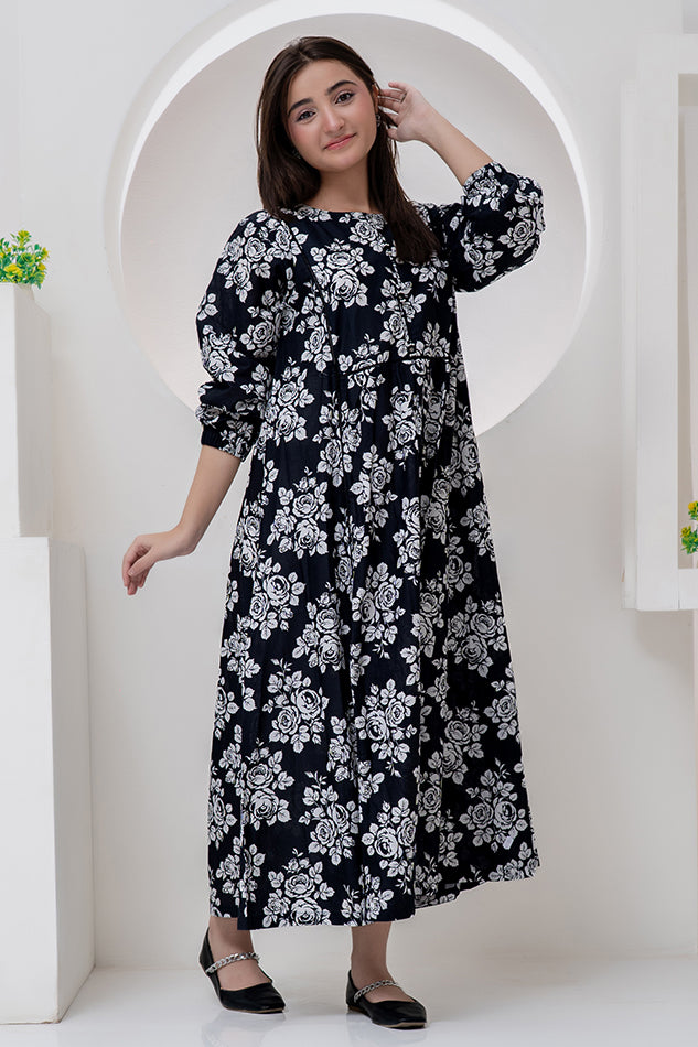 Upgrade your style with this graceful black digital printed long maxi, designed in premium cotton lawn fabric. Featuring an all-over floral print, round neckline with piping slit, and elastic full sleeves, this maxi offers elegance and comfort in every detail.