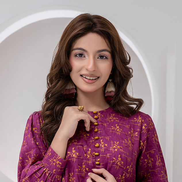 Revamp your style with this elegant purple maxi frock, crafted in soft cotton lawn fabric. Featuring a table print with gold paste detailing, a classic round neckline with button loops, and full puff sleeves with cuffs, this outfit is the perfect fusion of tradition and modern design.