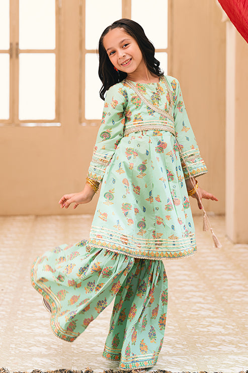 Bring elegance to your little one’s festive wardrobe with this stunning 2 Piece Mint Green Table Print Suit. Crafted from premium jacquard fabric, the outfit features a koti-style floral printed frock paired with a matching floral gharara, creating a graceful and traditional look. Perfect for parties, weddings, and festive celebrations, this ensemble blends comfort with style.